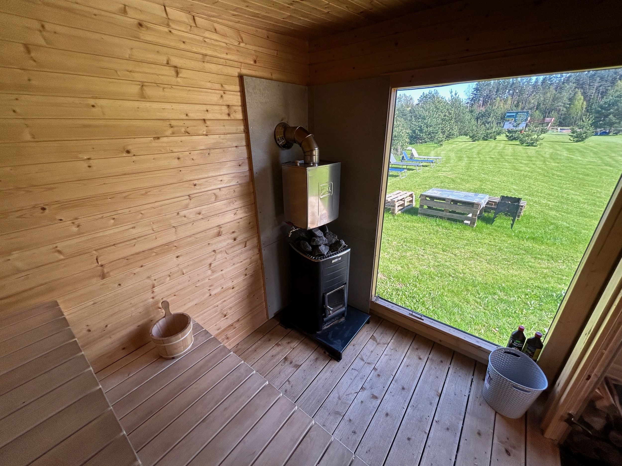 Šalia pirtelės yra šalykine. Taip pat yra gultai ant kurių gulint galima pasimėgaut gamta.
